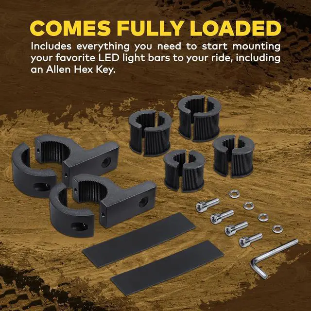 The rubber teeth also help dampen vibrations stops the metal from being worn down and keeps your bars protected all the way through. STURDY ALUMINUM & RUBBER STRIP- The Mini Bar Clamp is built using precision-welded cast aluminum allowing it to be both lightweight and durable and easy to hang onto (get it? ). For mounting onto the aluminum teeth directly the mini bar clamp comes with an additional rubber strip to prevent the aluminum from being worn down. NO DRILLING - Tired on drilling holes on your bar? Us too. With the mini bar clamp simply bolt it over your handlebars and mount your light bar onto the clamp.