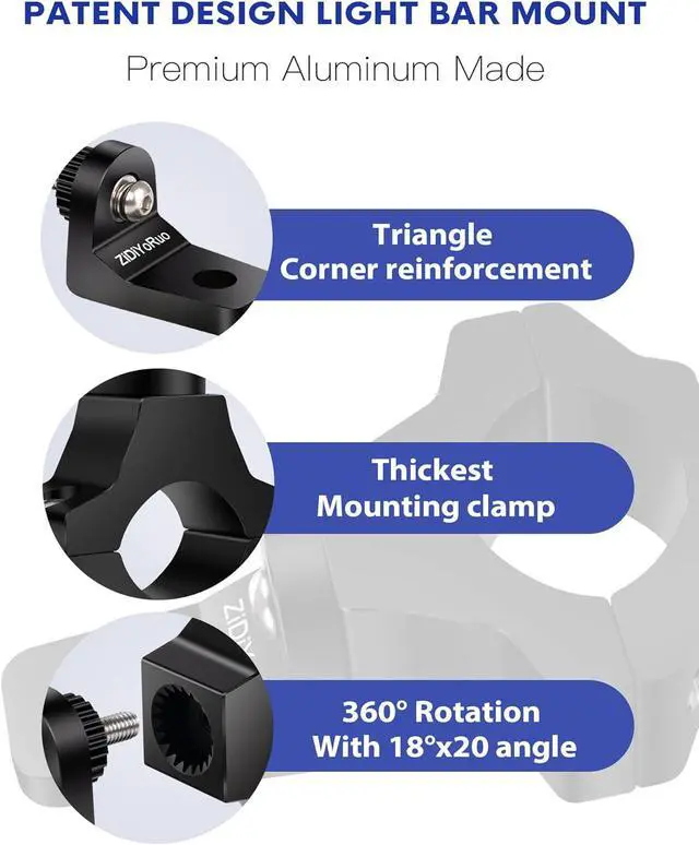 1. Optimal Lighting Positioning - Off-Road Light Bar Mount and Cube Light Bar Mounts feature a 360° angle rotation for customized Motorcycle and ATVs lighting angles to meet all your off-road needs. Fits 0.75 - 1.5 bars2. Rock-Solid Stability - Hang tough on even the roughest rides with our durable mount designed to secure a variety of lighting options. 3. Easy Installation - This motorcyle ATVs Bars Size compatible mount includes an Allen key to make your installation process a snap! 4. Built to Last - Constructed with 6063 aluminum alloy materials our LED Light Bar Bracket was built to withstand tough off-road conditions and provide long-lasting use.