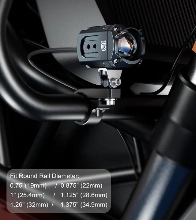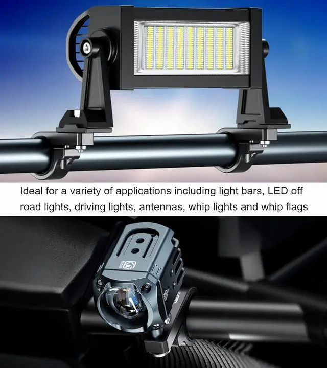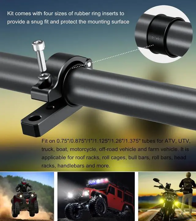 The light mounts made of 6061-T6 aluminum alloy material with CNC machining and iii grade hard anodized surface for durability and reliability in the most demanding environmentsFit for round rails 0.875 (22mm) 1( 25.4 mm) 1.125 ( 28.6 mm) 1.26 (32mm) 1.375 ( 34.92 mm) in diameter for ATV Quad ATV goltf cart 4-wheeler truck boat bike bicycle motorcycle UTV off-road vehicle and farm vehicleThe light bar mounts with 10mm diameter screw mounting hole. Ideal for a variety of applications including light bars LED off road lights driving lights antennas whip lights and whip flagsKit comes with four sizes of rubber ring inserts to provide a snug fit and protect the mounting surface.