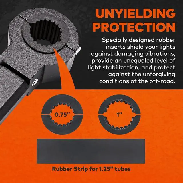 UNYIELDING PROTECTION - Specially designed rubber inserts shield your lights against damaging vibrations provide an unequaled level of light stabilization and protect against the unforgiving conditions of the off-road. UNMATCHED VERSATILITY - Go anywhere with a clamp that is as flexible as your machine. These clamps include adapters to fit. 75 1 and 1.25 bars and two different length mounting neck with studs for added clearance adjustment. BRAND-NEW & BACKED 100% brand-new never used and covered by a 1-year original manufacturer warranty. Got questions? Hit us upwere here to help.