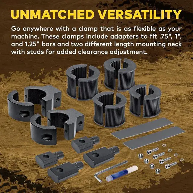 LIVE WITHOUT LIMITS - Don't be held back by one-dimensional bar clamps. Our unique clamping system features a 360-degree rotating neck designed to give you even more control over your light placement regardless of the position or angle of your bars. HANG ON TIGHT - Aggressive straight knurling on the mounting surfaces gives your lights the traction they need to hold on through the harshest terrain. And with a zero-slip locking stud design these clamps won't twist when you twist the throttle. ROCK SOLID - On the trail there's no room for weak hardware. Engineered to be thicker and more durable than other bar clamps and equipped with rugged stainless steel bolts these bar clamps have earned their place at the top of the podium.