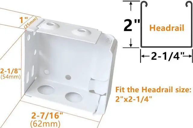 Box Bracket Dimensions: 2-1/8 (54mm) x 2-7/16 (62mm) x 1 (25mm) CompatibilityFits only high profile square blind headrails measuring 2-1/8 (54mm) x 2-7/16 (62mm). Recommended for headrails around 2 (51mm) x 2-1/4 (57mm) in size.