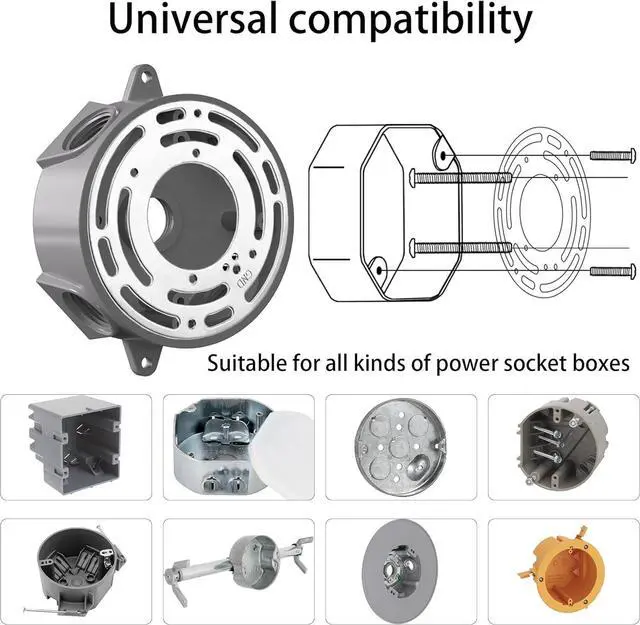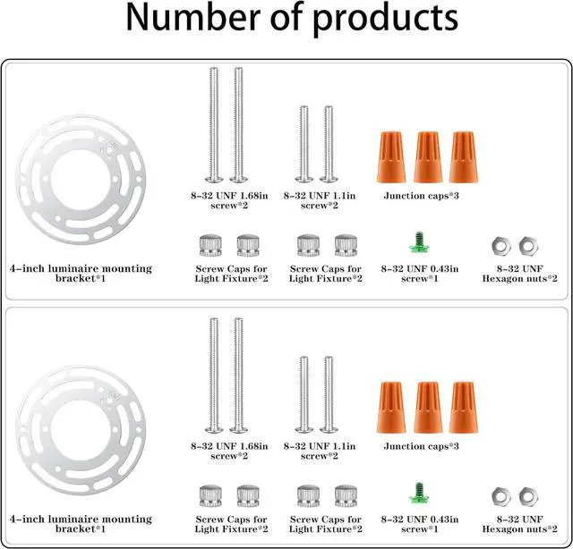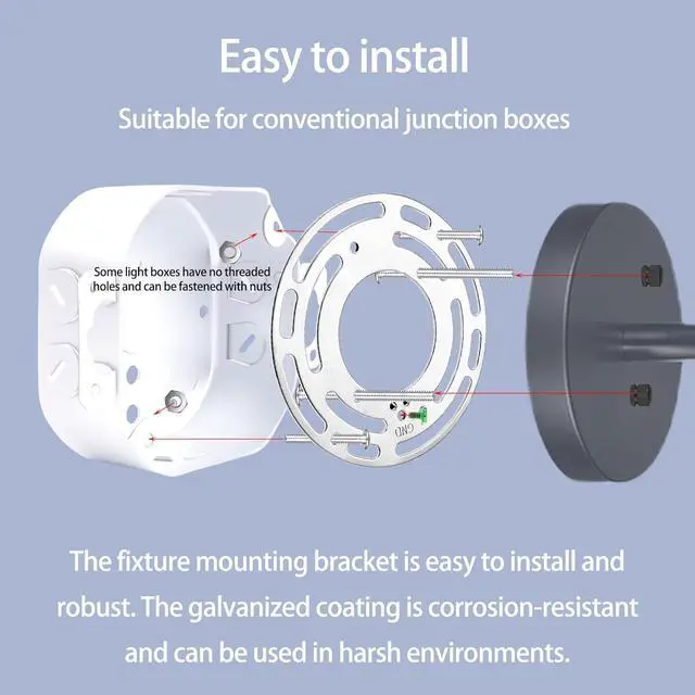 PACKAGE INCLUDES2 x light fixture crossbars; 4 x crossbar mounting screws; 4 x ground screws; 6 x wiring nuts 4 x black acorn cap nuts 4 x silver acorn cap nuts. DURABLE MATERIAL2 Sets universal crossbars are made of high quality zinc plated steel: durable and rust resistant for ensuring your safe use and reliability for a longer service life. WIDE APPLICATION This light fixture mounting bracket adapter is designed to attach fixtures and canopies to electrical junction boxes. 2 Pack can satisfy your multiple needs you can use it for mount wall light close to ceiling light LED light pendant light and chandelier bathroom vanity light fixtures. EASY TO USE4 Inches diameter universal mounting plate fits most ceiling lights. Including ground screws wiring nuts and crossbar mounting screws you just use it to mount light fixtures without buying other mounting hardware. OUR GUARANTEEIf you are not satisfied for any reason just return for a refund of your purchase price; we promise 24 hours customer support please feel to contact us for any product&order problem.