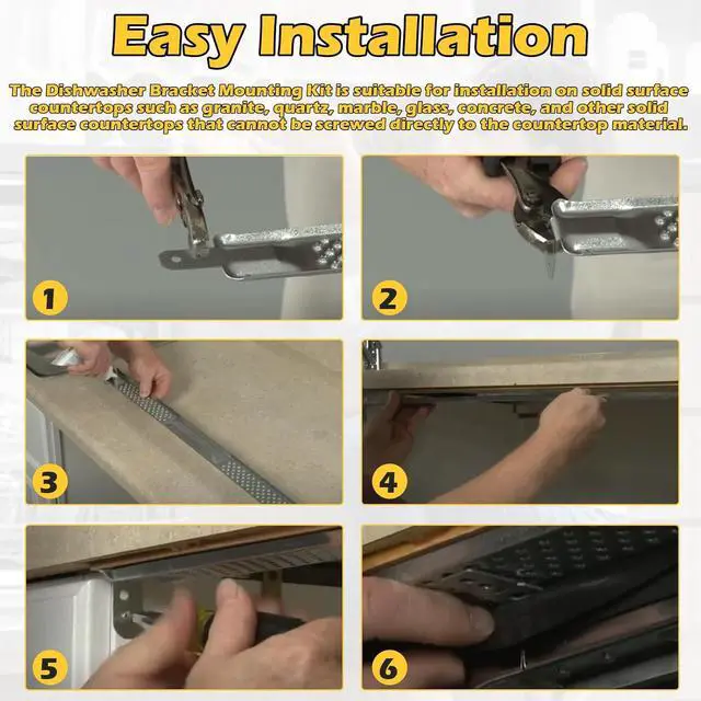 Installation: The Dishwasher Bracket Mounting Kit is suitable for installation on solid surface countertops such as granite quartz marble glass concrete and other similar materials that cannot be screwed directly to.