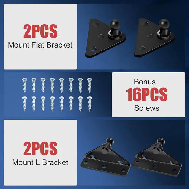 Applicable Scenario10MM gas strut mounting bracket work for any gas spring with a connector bore diameter of 10mm. Euplokeer bracket compatible with most gas springs on the market. Special structural design10mm ball head perfectly matches 10mm gas prop. 2pcs L-Type and 2pcs Flat-Type structure design makes the process of installing gas springs less troublesome in terms of mismatching angles. Bonus 16 screws for installation. Product Basic InformationMade of heavy-duty steel maximum load 250LB. Black galvanized coating for corrosion resistance. Multi-PurposeThe ball mount is usually used in conjunction with a set of gas shock for some DIY projects such as cabinets boxes lid hatches cellar doors bar window etc.