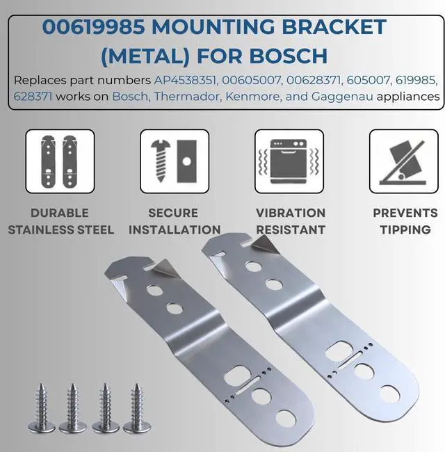 Compatible with Bosch & Leading Brands - Directly replaces part numbers 619985 00605007 00628371 AP4538351 AH3478789 EA3478789 and moreno guessing required. Broad Compatibility & Direct FitThese brackets are pre? punched and angled to fit the mounting holes on most Bosch models (e. g. SHX SHE S SHV series) as well as compatible Kenmore Thermador and Gaggenau dishwashers. Simply match your existing part numbersuch as 619985 00605007 or 00628371and swap in the new brackets for a precise fit. Robust Rust? Resistant MaterialsCrafted from heavy? gauge galvanized steel with a protective finish our brackets resist corrosion and retain strength over years of use.