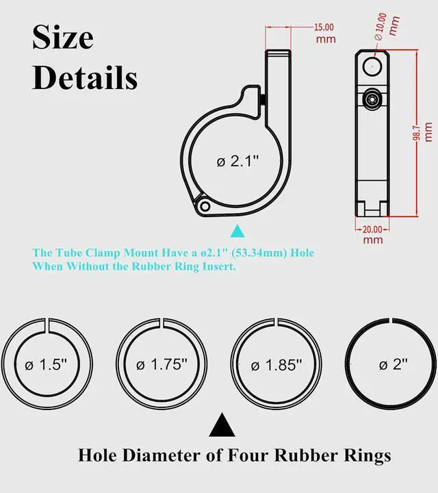 Rubber ring insert diameters: 1.5 ( 38.1 mm) 1.75 ( 44.45 mm) 1.85 ( 46.99 mm) 2.0 ( 50.8 mm). The light brackets have a 2.1 ( 53.34 mm) diameter mounting hole when without the rubber ring insertHinged design and single-bolt locking make installation easier. An Allen key is included in the package to facilitate your installation