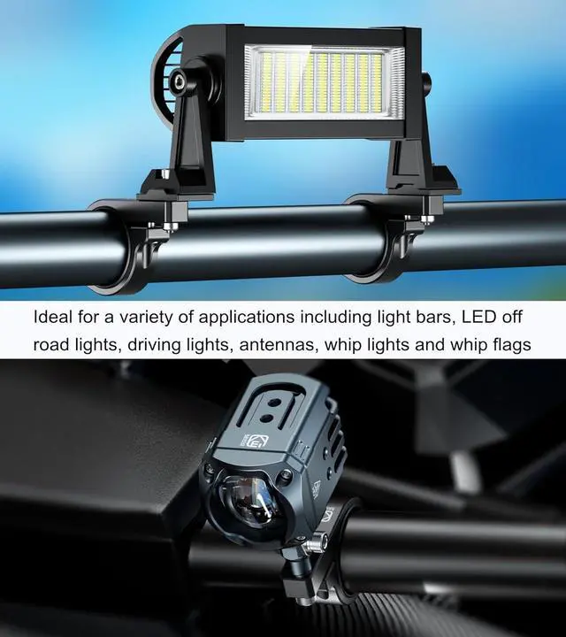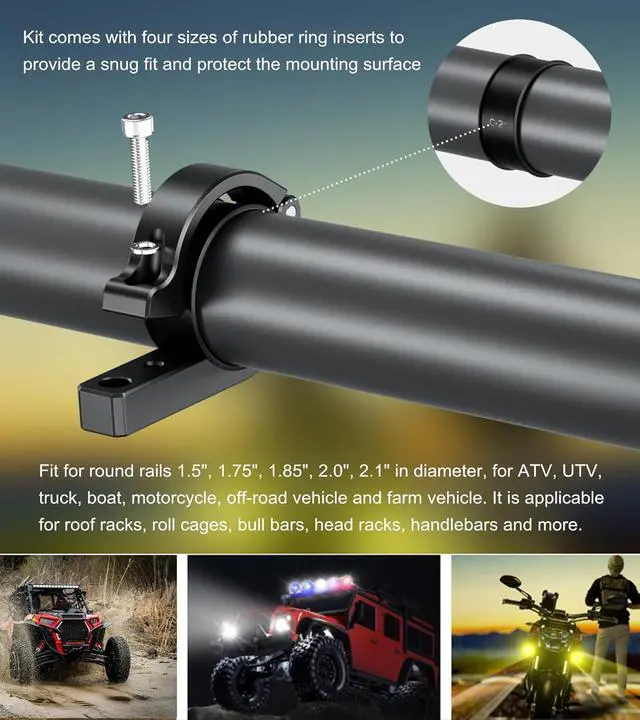 The light mounts made of 6061-T6 aluminum alloy material with CNC machining and iii grade hard anodized surface for durability and reliability in the most demanding environmentsFit for round rails 1.5 ( 38.1 mm) 1.75 ( 44.45 mm) 1.85 ( 46.99 mm) 2.0 ( 50.8 mm) 2.1 ( 53.34 mm) in diameter for ATV UTV truck boat motorcycle off-road vehicle and farm vehicleIt is applicable for roof racks roll cages bull bars head racks handlebars and more.