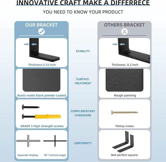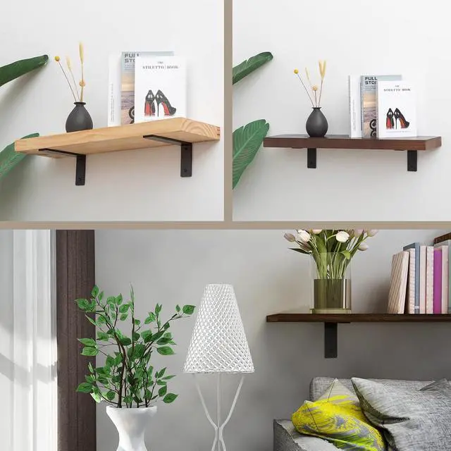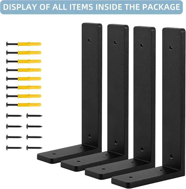 powder coating finished & Applicable place Matte black coated finish durable and sturdiness. PICESA bracket comes with traditional matte black It fits in perfectly in your farmhouse kitchen garage basement storage room and backyard. Complimentary hardwareComes with G5 high strength screws and authors as good as your local hardware chain store. screws and anchors are for different walls. Following the steps properly put your Pre-prepared lumber board on you will get your perfect and stable floating shelves.
