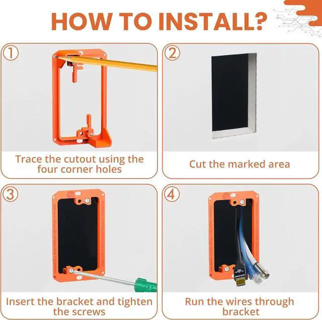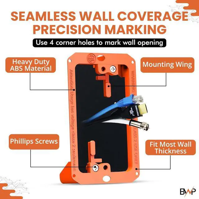 ???????????? -????????????????????????????????: Our wall plate mounting bracket includes a built-in cutout template and four corner marking holes to MARK WALL OPENING. This low voltage box 1 gang can be installed vertically or horizontally Ideal for a few renovation projects at home or in the office.??????????????????????????????????????????????????????????: The BWP single gang low voltage mounting bracket is specifically designed for flush mounting wall plates. This single gang cut-in box functions as a reliable drywall outlet box ensuring wall plates sit flush with the surface for a smooth professional installation.?????????????????????????????????????????????? -??????????????????????????????????????: This versatile low voltage cut-in ring easily adjusts to accommodate wall thicknesses from 1/4-inch to 1-inch making it the ideal solution for mounting low voltage wires such as phone internet TV and video with a clean professional finish.??????????????????????????????????: This electrical mounting bracket works seamlessly with speaker wires coaxial HDMI and data cables offering a versatile low voltage gang box solution for any audio & video setup.????????????????????????????????: Our low voltage bracket comes with a 180-day warranty for quality assurance and we provide dedicated customer assistance to address any inquiries or issues you may have.