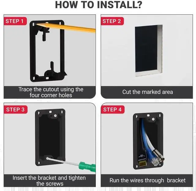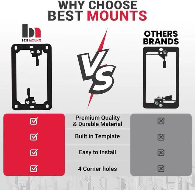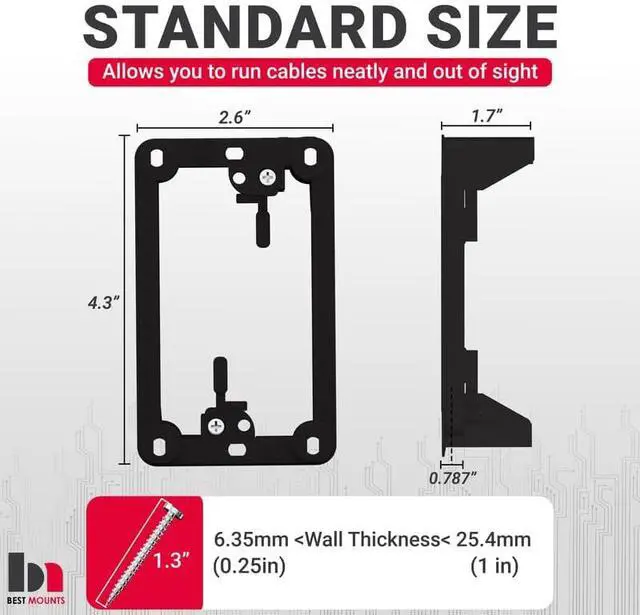??????????????????????????????????????????????????????????: The Best mounts single gang low voltage mounting bracket is specifically designed for flush mounting wall plates allowing them to be installed seamlessly with the wall surface.??????????????????????????????????????????????????????????????????????????????: Our low voltage bracket adjusts to fit various wall thickness from 1/4-inch to 1-inch thick wall board paneling or drywalll Ideal solution for mounting low voltage wires (phone internet TV video).????????????????????????: Bracket includes its own cut-out template. Use 4 corner holes to mark the wall opening. Can be installed vertically or horizontally perfect for home or office renovation projects with low-voltage devices????????????????????????????????????????????: Our drywall bracket is widely compatible with speaker wires coaxial HDMI and data/communication cables offering versatile installation options for your audio & video system.????????????????????????????????: Our low voltage bracket comes with a 180-day warranty for quality assurance and we provide dedicated customer assistance to address any inquiries or issues you may have.