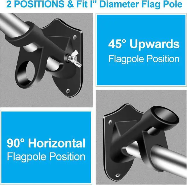 Two-Positions Flagpole Bracket: 2 Positions hole design can be installed with 45 degree upwards angle or 90 degree vertical angle. Allow you freely switch the angle of the flagpole our wall mount flagpole holders will help you better show your love flag. Fit For 1