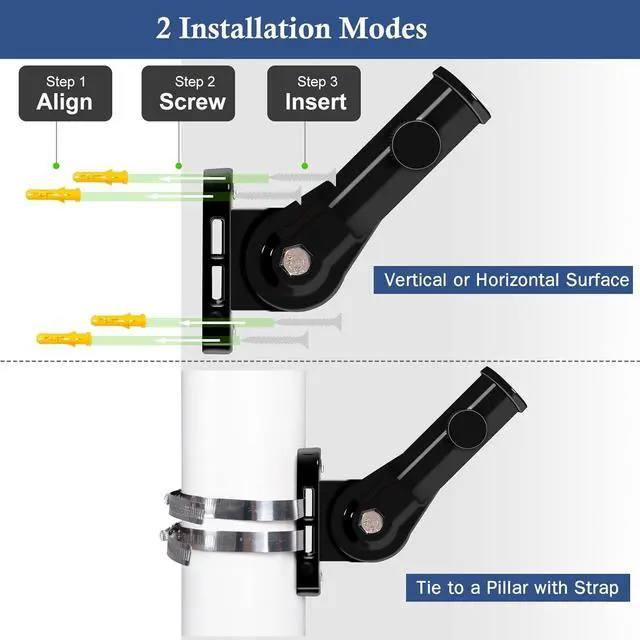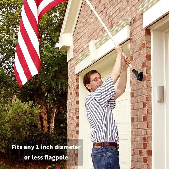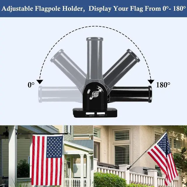 Multi-angle Display FlagsThe adjustable flagpole holder makes it easy to display your flag perfectly from 0°- 180°. This mounting unit is truly the perfect flagpole hardware while it fits most 1-inch diameter wooden or metal flagpoles. Sturdy and DurableMade of premium aluminum alloy and rust proof coated this flag pole mounting bracket is extremely durable and can be used in both indoors and outdoors. Precision polishing process makes the surface of the flagpole holder smoother to ensure that the flagpole or hands are not scratched during installation. 2 Installation ModesThe flagpole bracket is easy to install and can be fixed onto most vertical or horizontal surface using the screws provided;