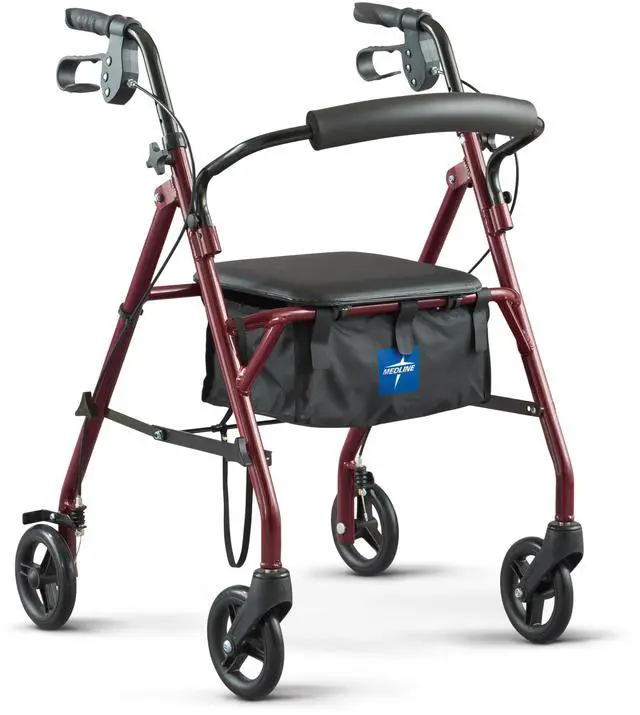 Trusted by healthcare workers and hospitals everywhere, 's steel rollator walker with padded seat and backrest is perfect support for seniors, adults and elderly and those who have mobility impairments. Available at great value, this rollator is equipped with 6" wheels to easily move from indoors to outdoors smoother than ever before. Features 12x12" black padded seat, weighs 16.5 lbs., supports up to 350 lbs., and comes in a burgundy steel frame. This walker is great for adults and seniors and those with limited movement ability. Fit with spacious under bag storage, transporting yourself and your essential safely has never been so convenient. To engage breaks, simply squeeze the easy-grip handles. To keep the wheels in a safe, locked position, push grip handles to the down position. This prevents the rollator from moving when standing still, sitting down or standing up. Easily adjust the height of handles 31-35" to your perfect fit.