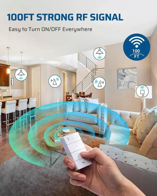Remotely turn on/off ceiling lights, plug-in pendant, standing floor lamps, table top lamps, hard-to-reach lights with a push of a wall switch.