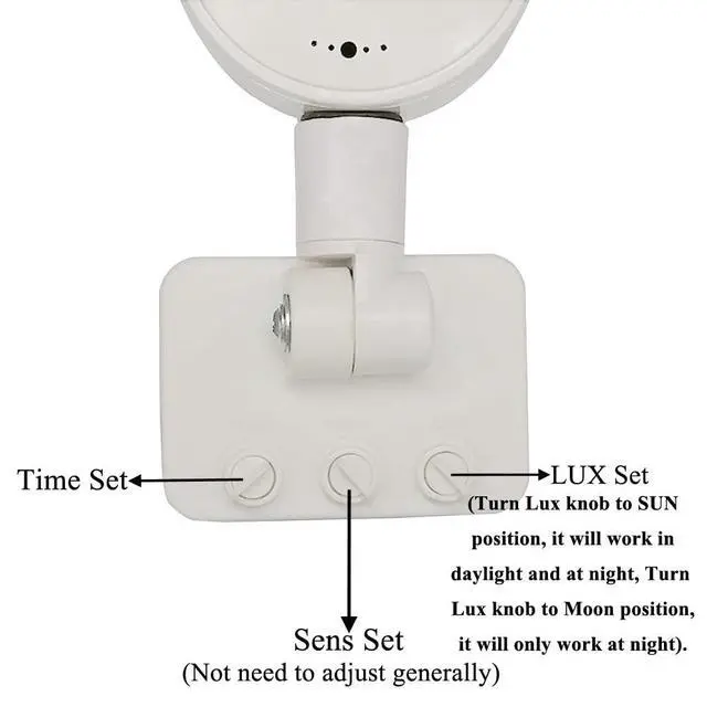 Lux Button: Lux Button adjustment can adjust the light to work all day or only at night, Turn LUX knob to SUN position, it will work in daylight and