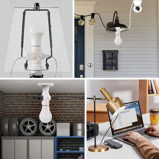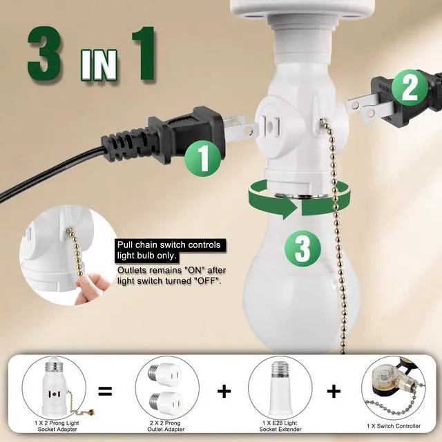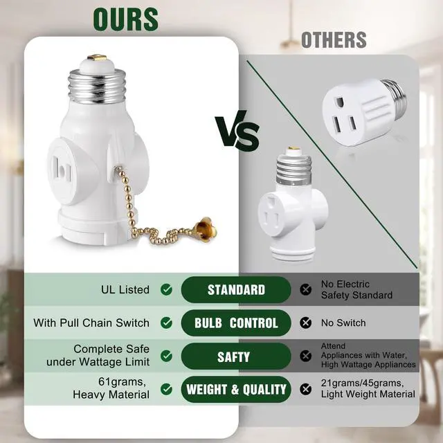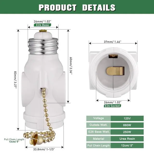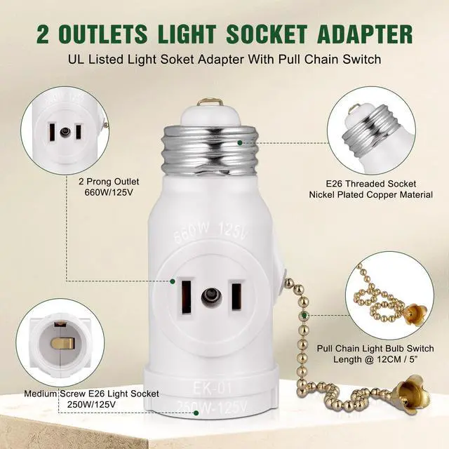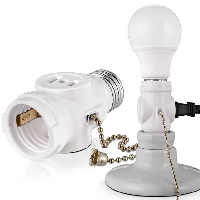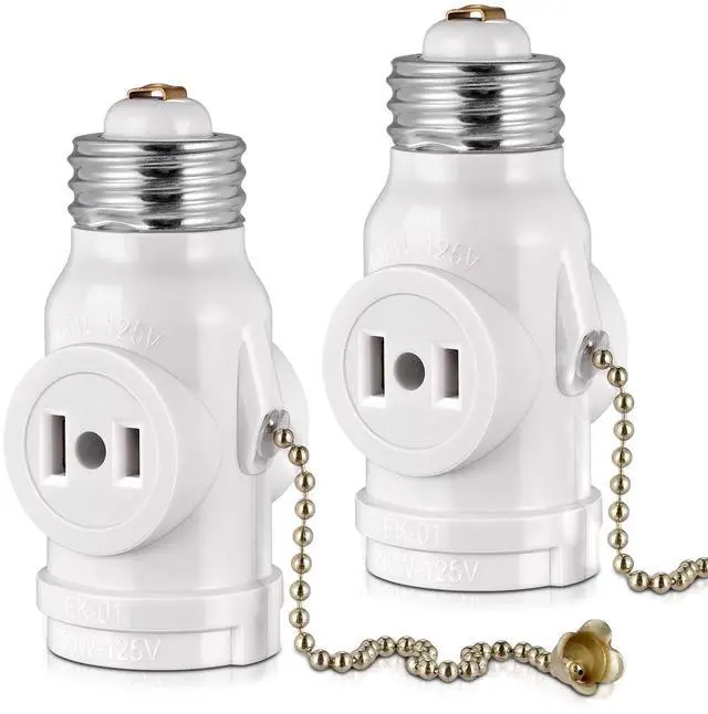Pull Chain Switch Light Socket Outlet Adapter,Converts Screw Light Bulb Socket into outlets,with ON/OFF Pull Chain Switch,UL Listed