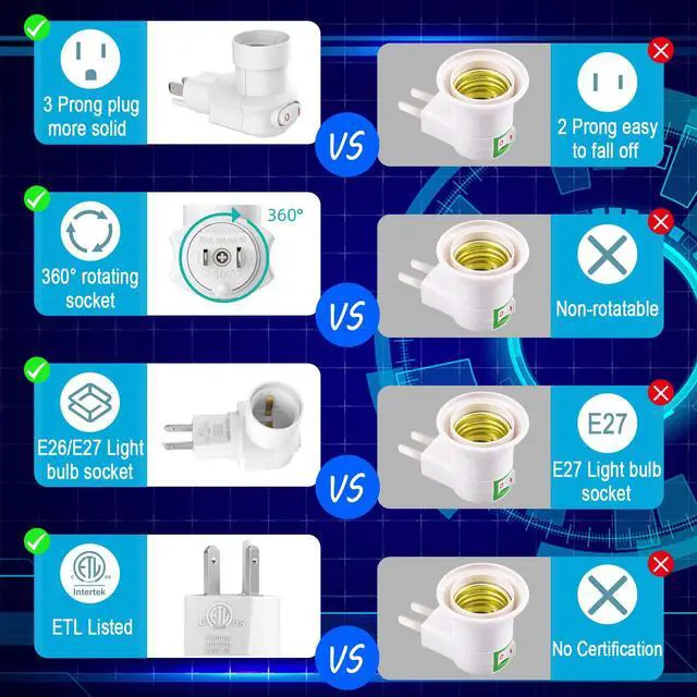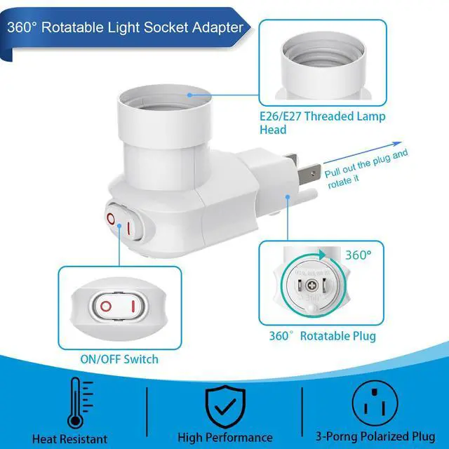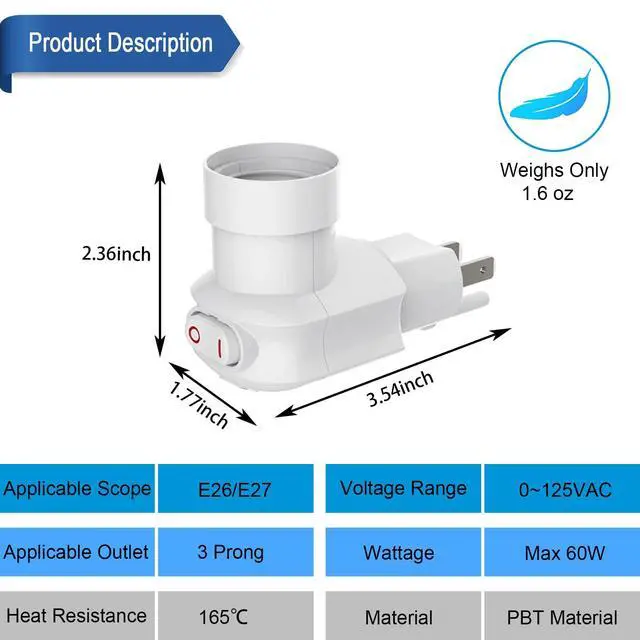 This 3-prong light plug adapter is powered by 125VAC and has a max wattage of 60W. Internal use of high-quality copper conductor, high conductivity. V0 grade PBT flame retardant material put an end to safety risks.