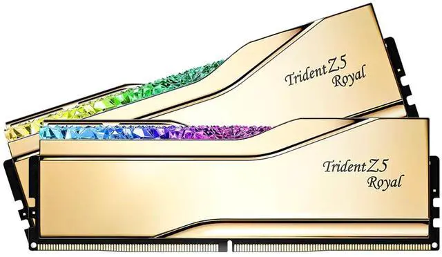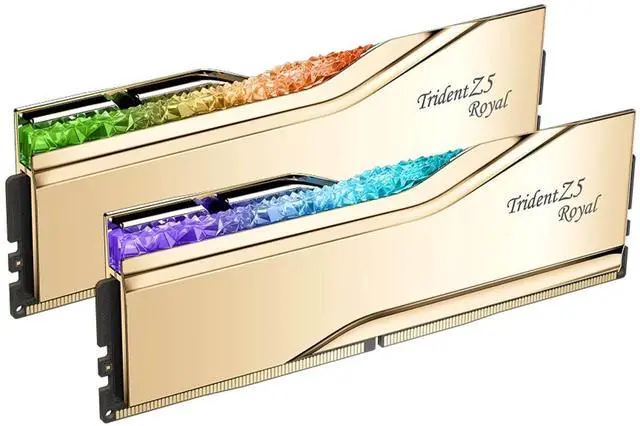 Trident Z5 Royal is the luxury-class of extreme overclock performance DDR5 memory designed for Intel platforms, featuring a crown jewel design with a crystalline light bar for a magnificent display of customizable RGB lighting and electroplated aluminum heatspreaders with a mirrored finish in gold or silver colors.