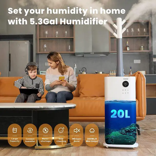 Large Tank for Whole House: 5.3Gal/20L water tank, designed for large spaces up to 2000 sq. ft. Tower humidifier with top fill design makes it easy to add water from the top.