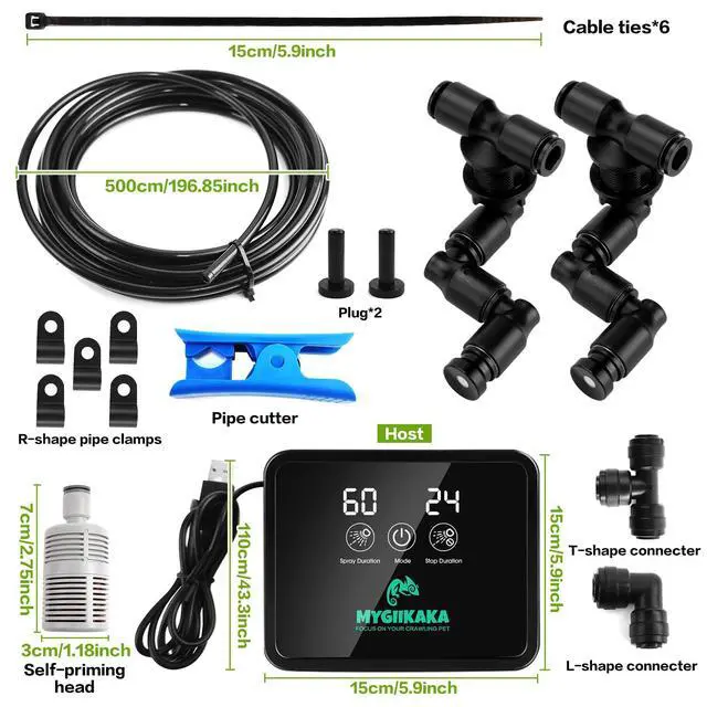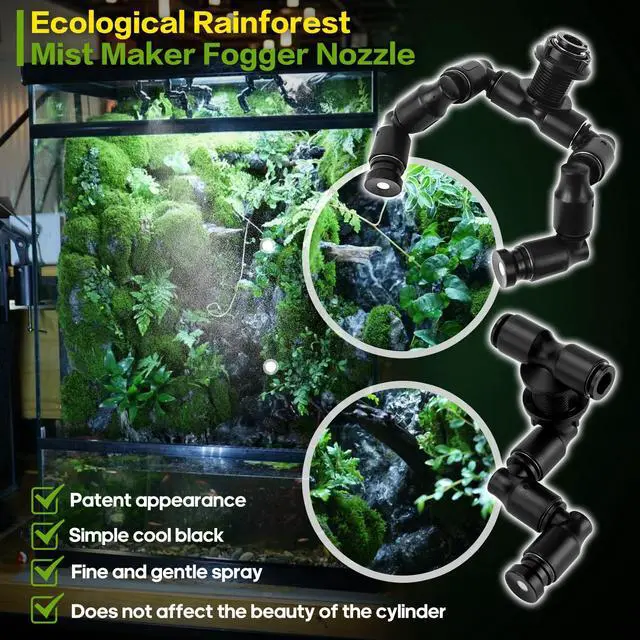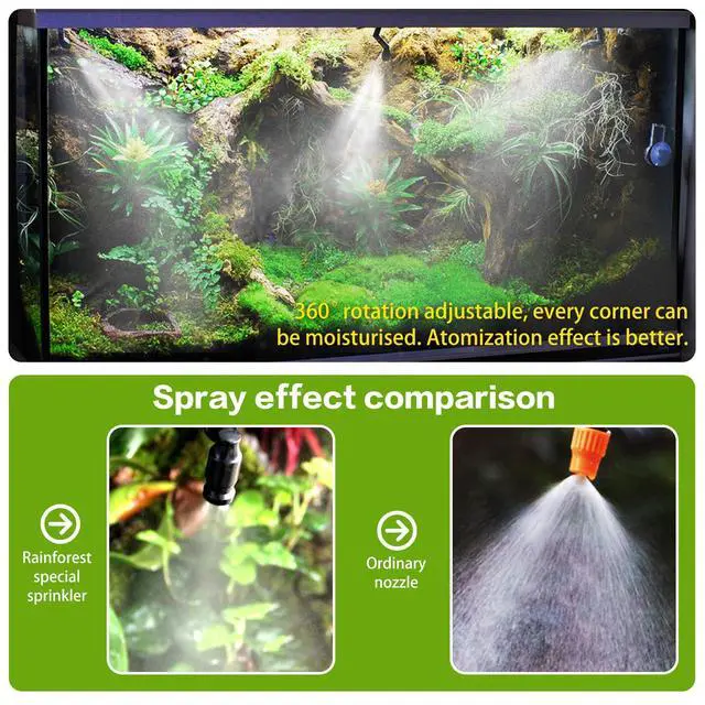 High Density Atomization Our reptile mister has two 360 adjustable nozzles, using them can add humidity to your terrarium in all directions and quickly. Note: The spray effect is water mist particles rather than mist. This reptile mister is easy to install and ready to use in minutes. reptile humidifier provides all the accessories you need - main unit, 2 spray heads, PE water hose, instruction manual, pipe cutter, self-priming head, tee, elbow 5 R clip, 2 plugs and 5 cable ties, all These all allow you to easily DIY your own reptile Terrariums or rainforest tank. USB powered for easy installation anywhere.