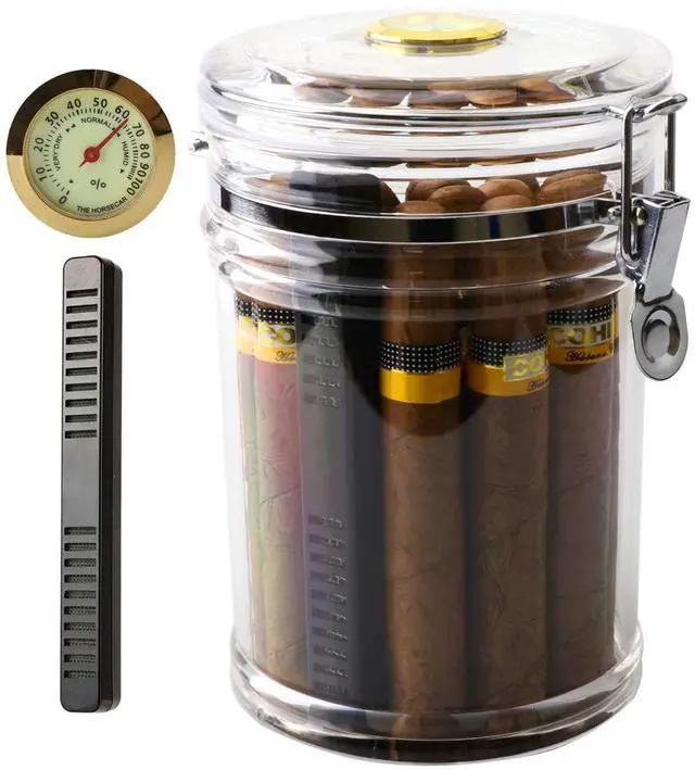 The acrylic humidor jar comes with a hygrometer,a humidifier and dropper,cedar wood lining,airtight rubber seal,strong sealing performance and long-term humidity retention,humidor jar can holds 15 to 20 cigars.