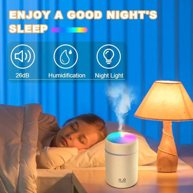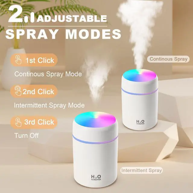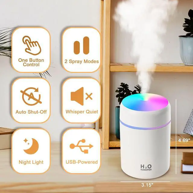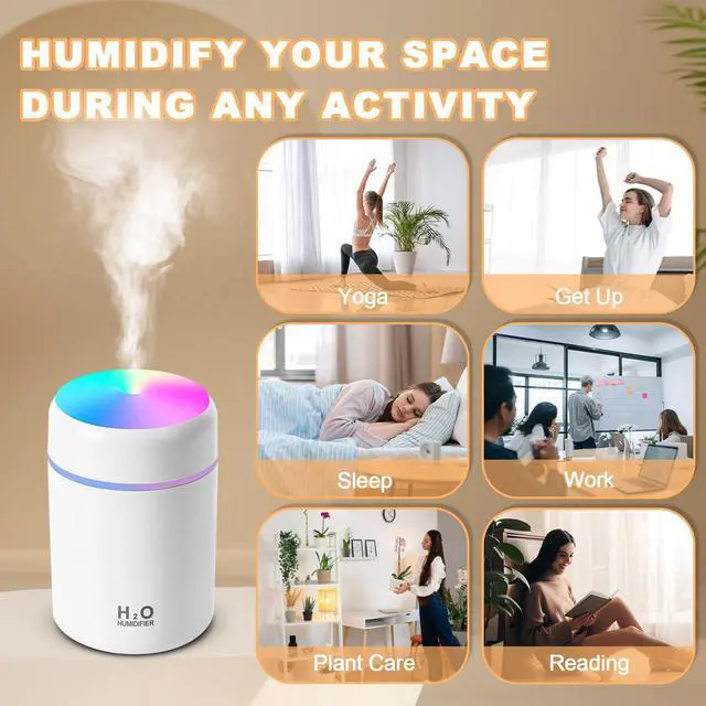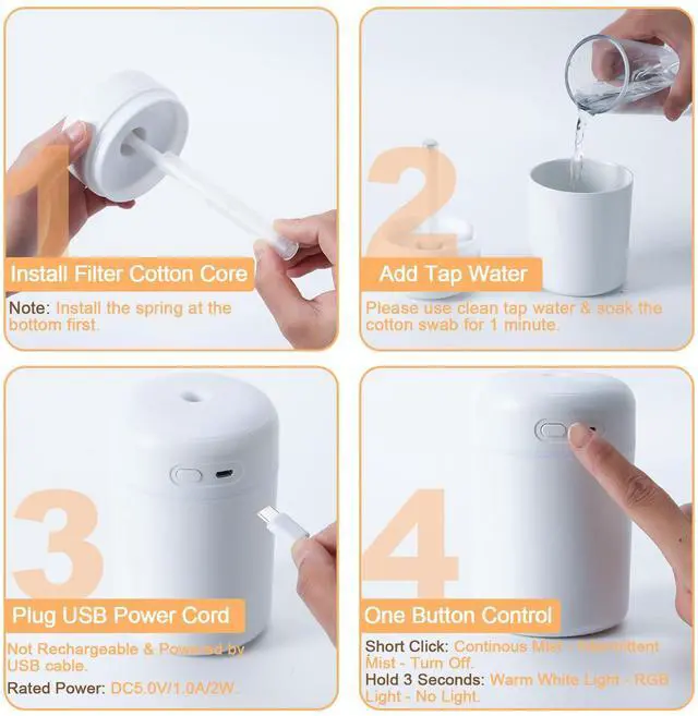 IMPORTANT NOTES Please use a certified power adapter with a DC5V/1A output. This humidifier does not have a built-in battery and requires a USB connection to function. Use only clean tap water. Do not use essential oils, perfumes, distilled water, or filtered water, as they can cause the cotton wick to clog and the humidifier to malfunction. Ensure that the cotton wick is fully soaked for a few minutes before turning the device on. After powering on, please wait up to one minute for the mist to begin.