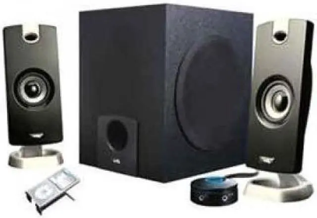 3-piece Subwoofer and Satellite Speaker System with Flat Panel design and Desktop control pod in retail packaging, Black finish; 5.2 RMS, 14 watts peak. Elegant and sleek, the CA-3090 is a 2.1 computer speaker system that offers you high quality sound without taking up too much desk space. The CA-3090s satellites allow an optimal listening experience by providing impeccable clarity. The separate control pod turns the speaker on and off, while sporting an LED power indicator. Satellite volume is easily adjustable via the control pod, which also has an optional auxiliary input and headphone jack. With subwoofer control located within reach, the bass volume level is conveniently scalable.