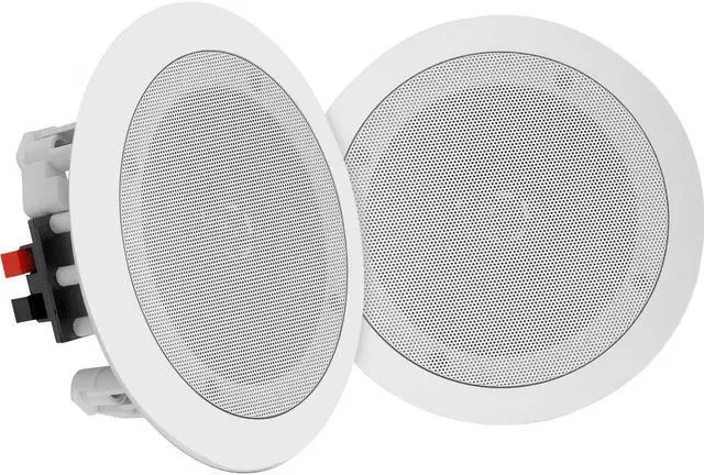 The Pyle In-Wall/Ceiling Speakers deliver stereo sound to any room in your home or office. Each speaker comes equipped with a high compliance polymer tweeter delivering a full, rich sound without cluttering floor space. The round style speakers are perfect for any custom audio application thanks to the stain-resistant grills and environmentally friendly ABS construction. The system features spring-loaded speaker terminals for quick connection and comes with a cut-out template for easy installation. Mount them in a convenient location on the wall or ceiling for a flush, clean look. Achieve wide-range sound performance and add audio to any room with the Pyle In-Wall/Ceiling Speakers.
