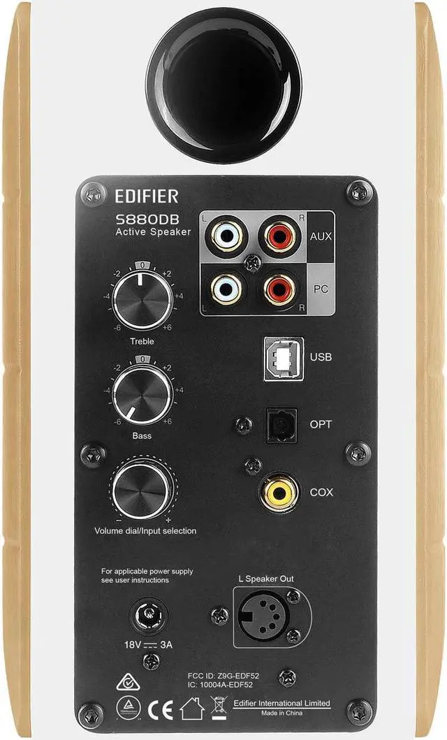 The S880DB has full list of inputs such as RCA, AUX, USB, optical, coaxial, and Bluetooth. USB, optical and coaxial sources have a sample signal rate of up to 192kHz. Alter volume, bass, and treble levels with knobs situated on the back of the active speaker.