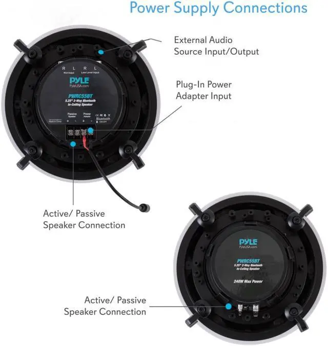 Enjoy stellar audio at home, in the office, or in your business with the Pyle Dual 5.25-Inch 240-Watt In-Wall/In-Ceiling Bluetooth Speaker Kit. This active + passive speaker system comes with (1) 5.25-inch active speaker, (1) 5.25-inch passive speaker, (2) 9.8-foot speaker connection wires, an installation cut-out template, and a power adapter.