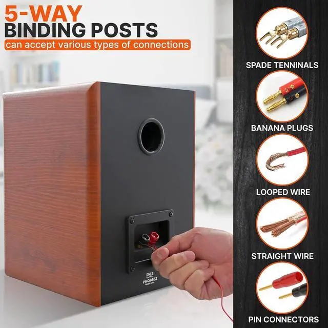 Pyle 5.25" Home Wooden Bookshelf Speakers, 200W Max Power, 1" Silk Dome Tweeter and Aluminum Voice Coils, Pair, Gold Plated 5 Way Binding Post, Rubber Surrounds, Beautiful Wood Grain Finish PHQBS52