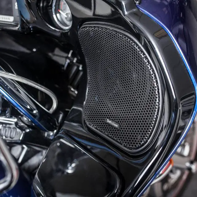 Each motorcycle speaker is made water/weather resistant with the addition of a Santoprene front isolation spider connecting between the tweeter housing and cone assembly. The motorcycle speaker requires no modification of the factory location and comes with new grille assemblies for both fairing and Tour-Pak applications.