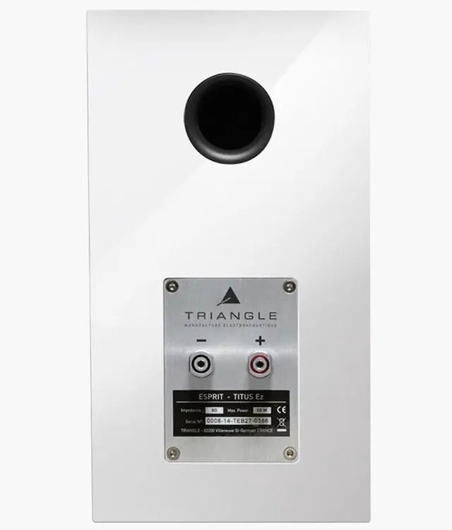The phase plug reduces the directivity of the high frequencies and assures an almost identic sound level throughout the room. Midrange DriverNatural cellulose paper coneMade out of 100% natural cellulose paper, white membrane is used to avoid any coloration. It is combined with a small pleat peripheral suspension to increase the emissive surface area. Special attention has been paid to a number of details in the development of the midrange: the profile of the membrane, the shape of the suspension, and the new dust cap, are directly inspired from the MAGELLAN project. WooferOverlay of textile material and fiberglassThe MAGELLAN program showed the importance of how the bass driver influences the behaviour of the medium driver. We control the cone so it efficiently muffles any resonance in the ½ upper bass area. Fiberglass was selected for its excellent affect on the lower midrange / higher bass. An Esprit Ez innovation is the overlay of textile material and fiberglass, which improves the rigidity of the membrane. The speaker is equipped with a new chassis, which quickly dissolves the heat generated by the coil, and with a double ferrite to improve sensitivity. Woofer / MidrangePolyvalenceTo sustain the TRIANGLE midrange quality, while providing deep bass, we have developed a half-roll suspension made of foam and treated rubber. It provides a dynamic performance due to the low inertia combined with the cellulose pulp cone. The profile of the cone was also redesigned and now provides an extended frequency response. Crossover & CablesAll components used in the crossover have been selected due to their quality: copper coils with a diameter of 1mm and met capacitors. The signal is transferred by a TRIANGLE OFC cable, which assures resistance and quality over time. Brushed Aluminum TerminalSpecially designed for ESPRIT Ez, the terminal is created in brushed aluminum, providing ease of use and extraordinary visual quality. The material prevents vibrations and seals the cabinet