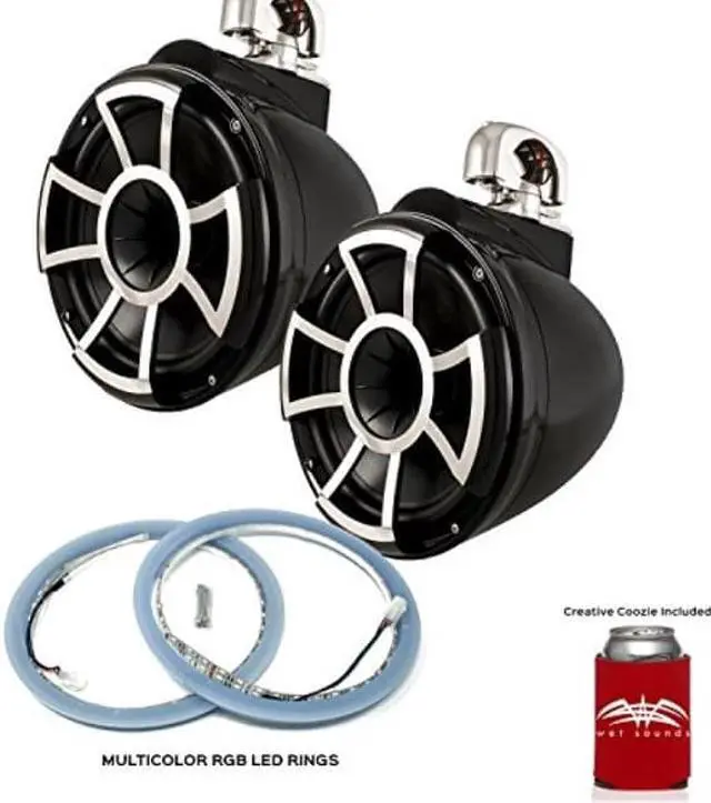 This bundle includes a pair of Wet Sounds REV10B-SC Revolution 10" EFG 4 ohm EFG HLCD Tower Speakers and a set of Wet Sounds LEDKITREV10-RGB RGB LED Speaker Rings The Revolution Series uses our proprietary REV TEC technology. Unlike most conventional designs, REV TEC technology provides remarkable volume and amazing full range sound quality on axis and off axis at long distances. Extensive acoustic testing has confirmed these speakers ability to project volume at 80 feet and beyond without any loss of detail or information. Not only does the Revolution series achieve volume and sound quality at a minimum of 80 ft, but with the REV TEC technology the rider can enjoy quality sound while riding outside the wake and being almost parallel to boat. Available with X Mount, Fixed Clamp or Swivel Clamp. Sold in pairs. Specs Impedance: 4 ohms RMS Watts: 300 PEAK Watts: 600 Frequency Response: 20Hz to 20KHZ Sensitivity: 92 db at 1watt/1 meter Mid Bass: 10 inch Kevlar reinforced EFG cone woofers with polyurethane surround. High Frequency: Pro-Axial Driver - Coaxially mounted Titanium Diaphragm High Output Size & Weight Front-Back: 13" (330.20mm) Hang Height 11 9/16" (293.68mm) Width: 10 5/8" (269.87mm) Hang Weight: 14.8 pounds / 6.71 kg each Note: All specifications are for each REV10 enclosure