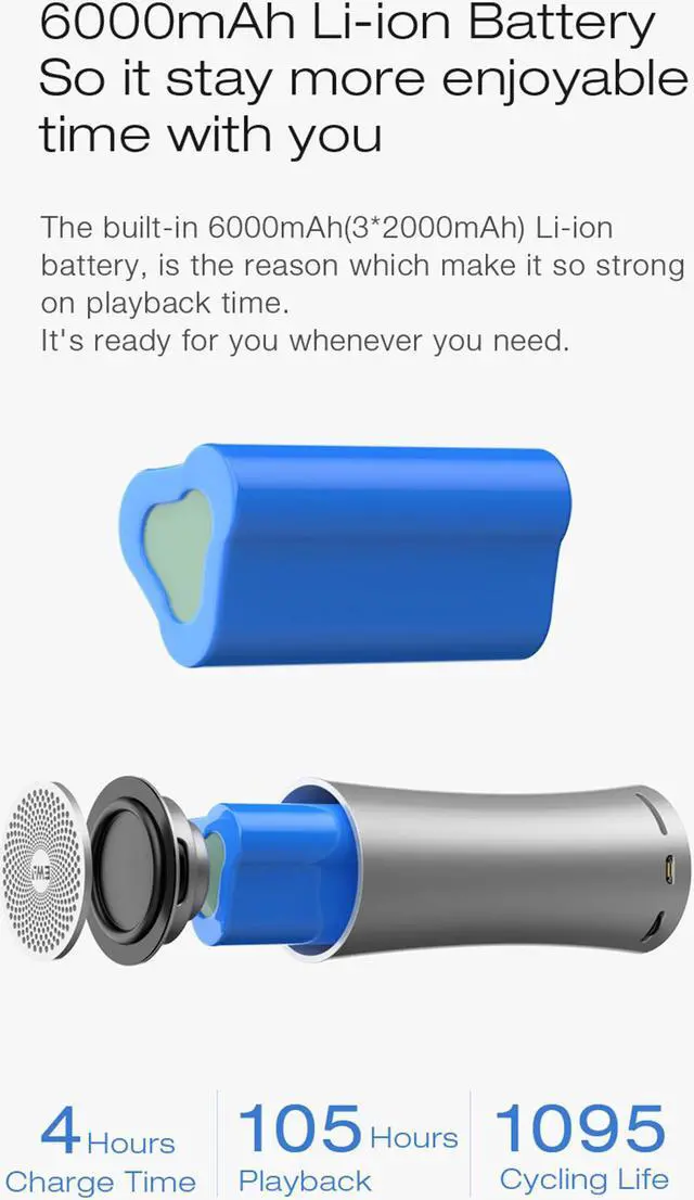 EWA A115 Super Battery 105-hours Playtime Bluetooth Speaker Built-in 6000mAh Rechargeable Battery Great Sound & Bass Handy with Small Bag (Silver) A115 speaker*1, USB charge cable*1, carry case*1, user manual*1.