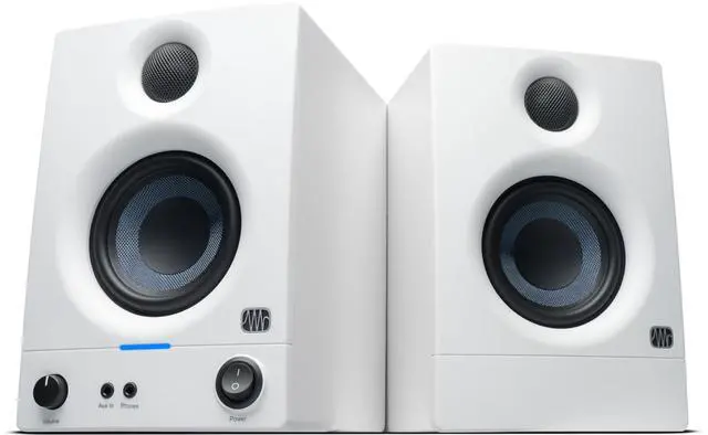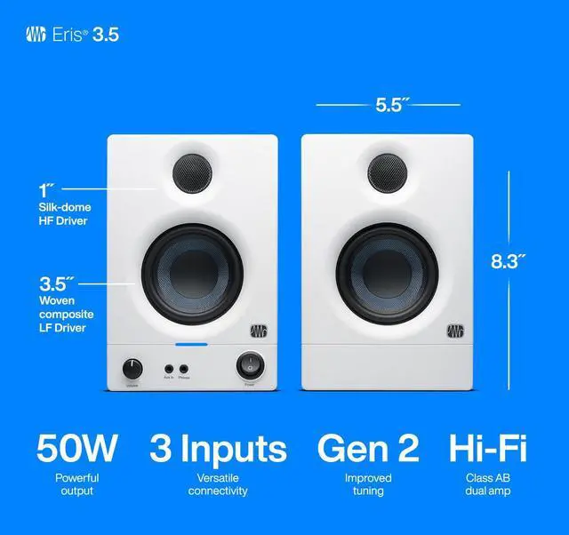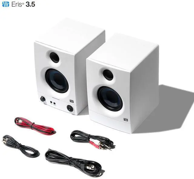 Find unparalleled audio clarity with the PreSonus Eris 3.5 3.5" 50W Active Media Reference Monitor, a top choice for audio engineers and producers worldwide who demand precision in their sound. These best-selling studio monitors have been enhanced to deliver even better performance, offering studio-quality sound in a sleek, compact design perfect for bedroom studios, video production, and high-fidelity gaming setups. Each monitor is powered by 25 watts, providing robust sound output while maintaining crystal-clear audio fidelity. The 3.5 -inch woven woofer is engineered to produce tight, impactful bass and a cleaner overall sound profile.
