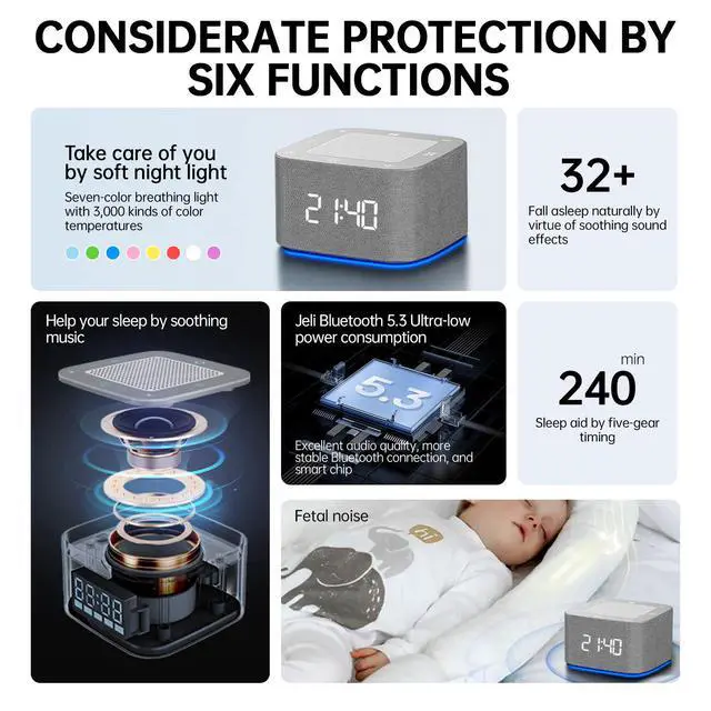 Wireless Bt Speaker 32 Soothing Sound Table Clock Night Light With Timer for Relax Sleep White Noise Sound Machine