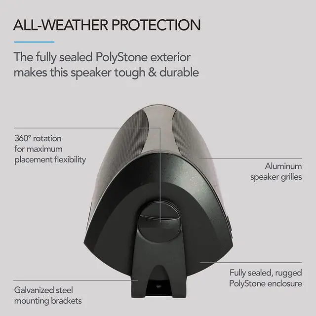 ALL-WEATHER PROTECTION The fully sealed PolyStone exterior makes this speaker tough & durable so it can withstand the harshest weather conditions. It is moisture resistant and wear resistant, making it an excellent choice for outdoor use