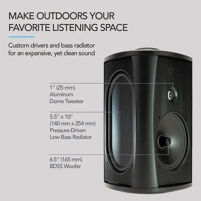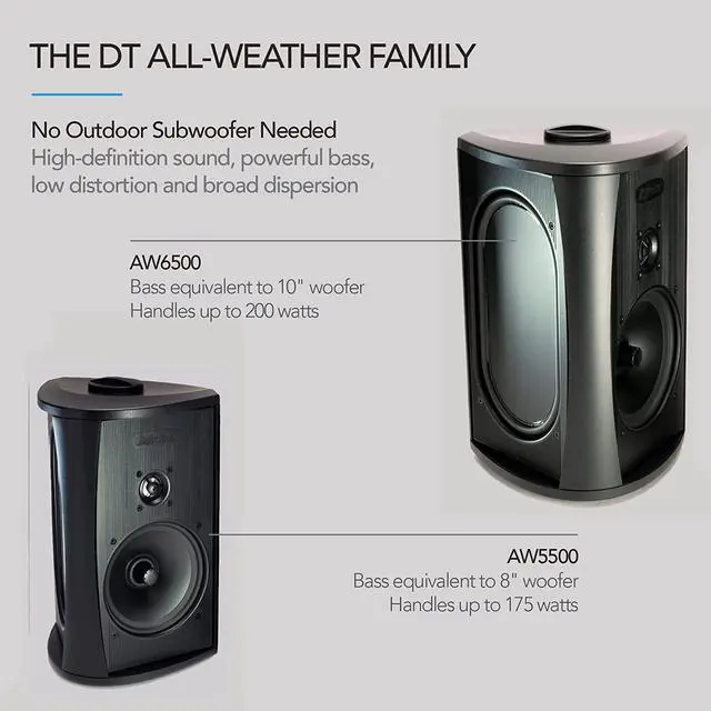 LOOKS GREAT, SOUNDS EVEN BETTER The AW Series is equipped with DTs Balanced Double Surround System (BDSS) drivers. This speaker has a 6.5" Mid/Woofer, a 1" Tweeter & a 5" x 10" oval pressure-driven low bass radiator for more accurate sound reproduction