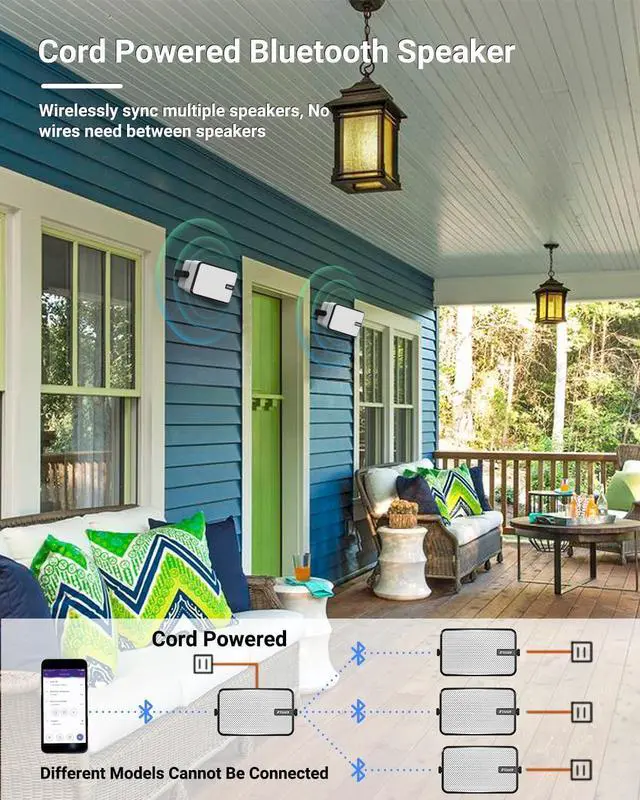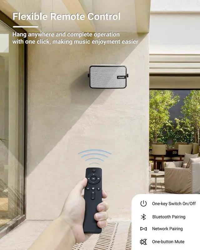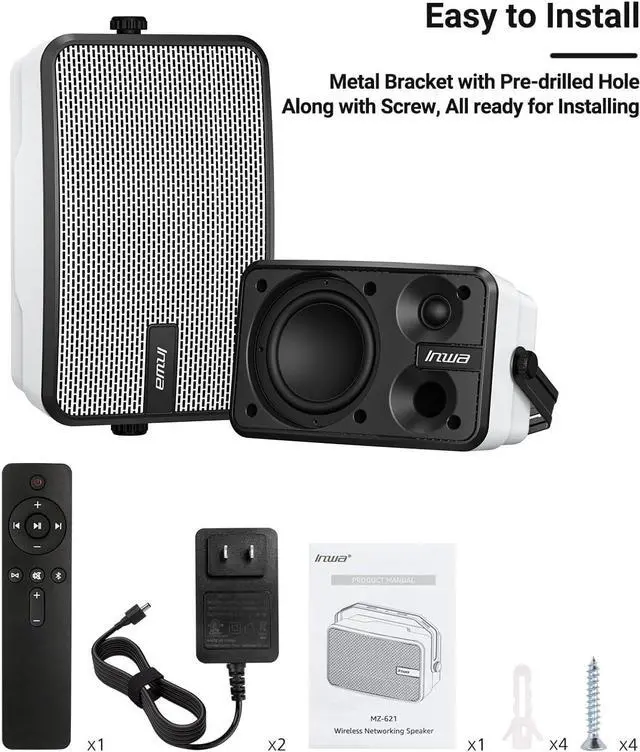 : With 9.4 inch in length, and 5.3 inch in height, this wireless speaker system comes with a remote control for easy operation and is suitable for many space, wherever on the underside of porch roof, under the patio cover, outdoor bar, gazebo, garage, small shop, etc. Arrived with all mounting accessories, very easy to install.