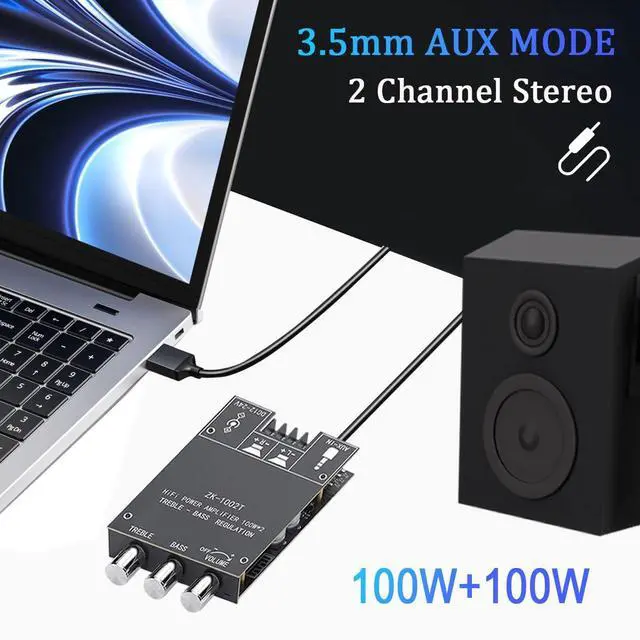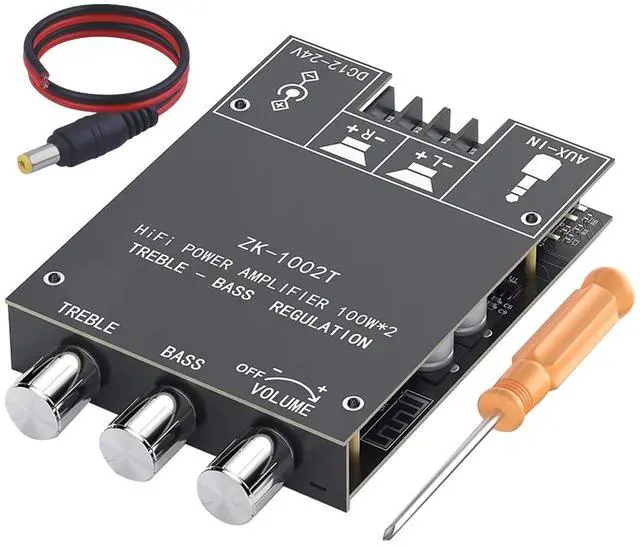 [Treble and Bass Controls] ZK1002T mini power amplifier board is designed with bass, treble and volume knobs, DC 9-24V, BT and AUX inputs. 2.0 Channel Stereo Amplifier Board for DIY wireless speakers, password free.