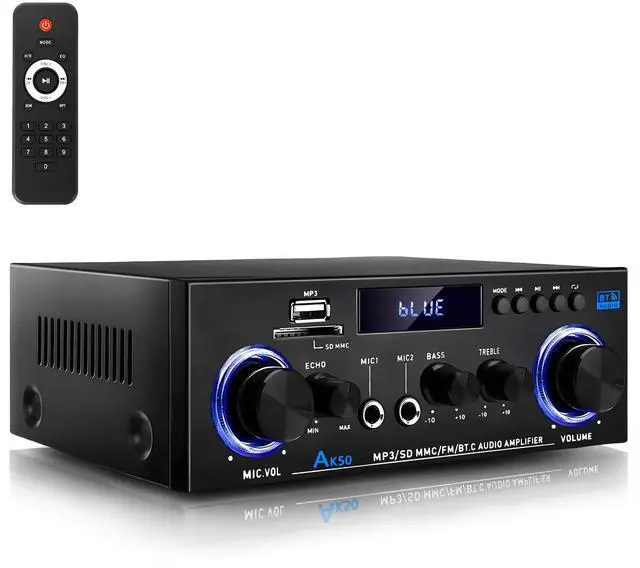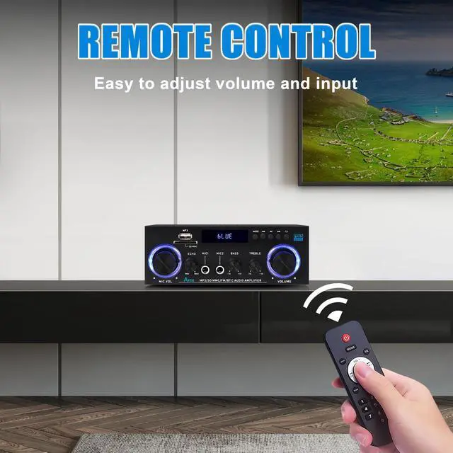 Bass & Treble ControlThe 2.0 channel home stereo amplifier with microphone volume, bass, treble, and master volume control knobs for finer adjustment of sound effects, fun and playable. The included remote control allows you to enjoy different music and sounds from your couch