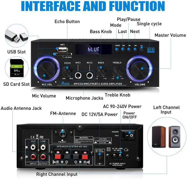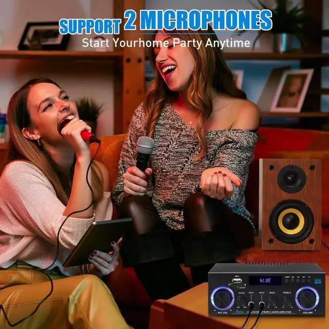 MIC & USB/ SD Card InputThe audio amplifier for speakers supports USB stick or SD card input, plug and play. Equipped with 2 microphone input jacks, you can carry a microphone to sing with your friends and family at parties