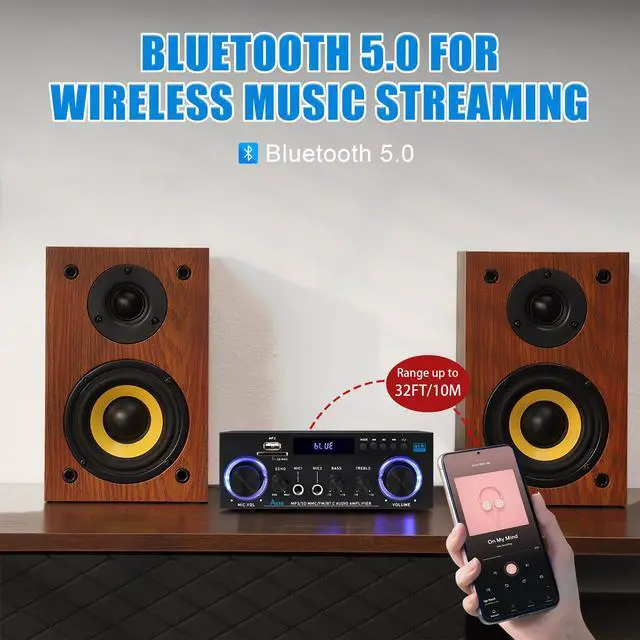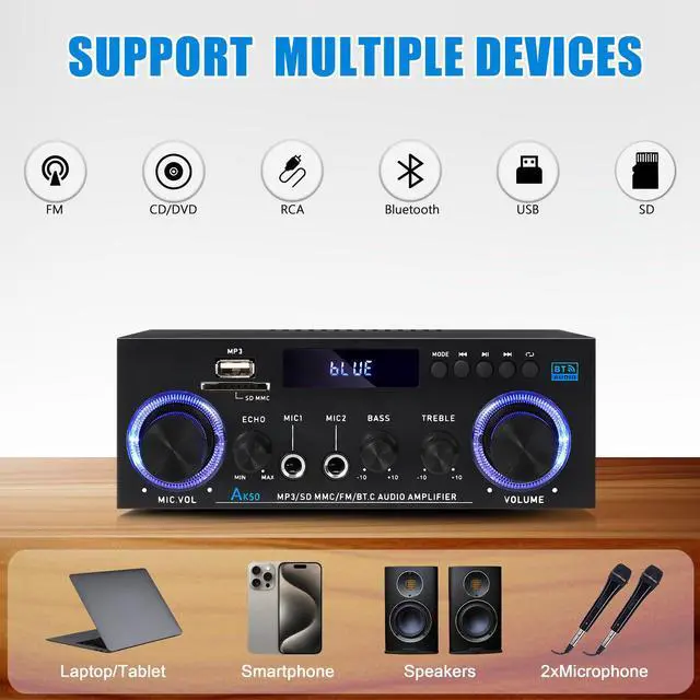 Multiple Input Modes : The mini stereo amplifier home audio supports multiple external signal sources: connecting to music streaming devices such as computers/mobile phones/laptops via Bluetooth, RCA and MIC inputs. Amp also supports microphone, USB port, SD card