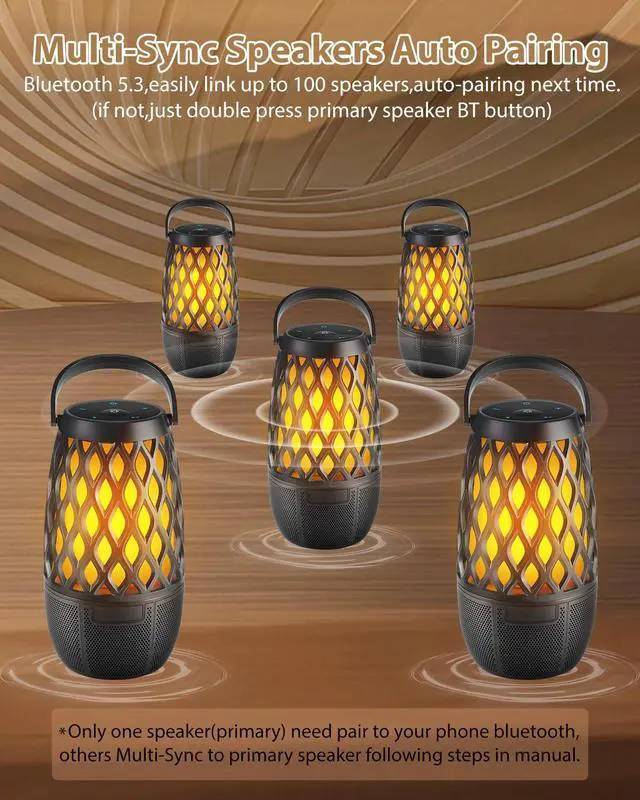 3 Mode Light Show -Perfect AmbianceThe outdoor speakers with light provide 3 light effects. Flickering flames for a cozy campfire vibe, breathing light for relaxation, and steady warm light for illumination. Perfect for any outdoor event, from romantic family gatherings to lively friends parties.