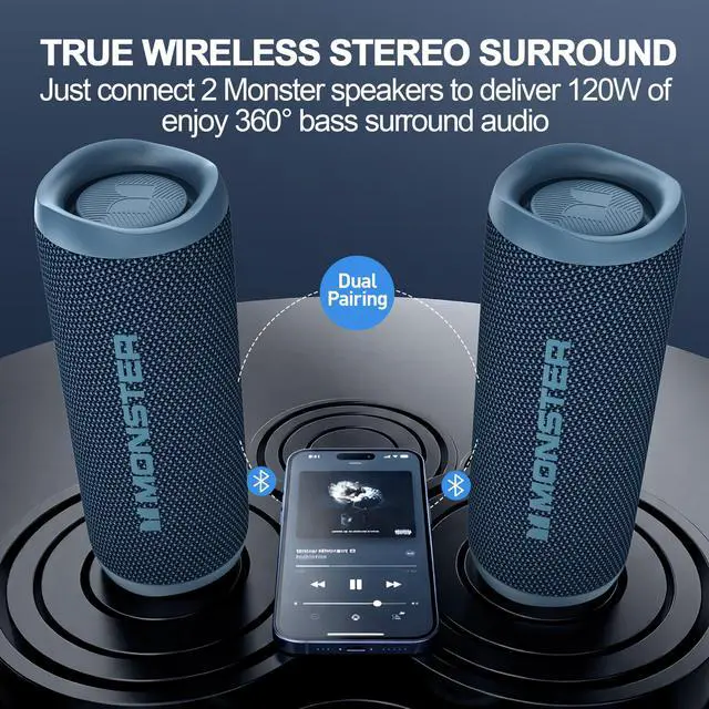 True Wireless Speaker True wireless stereo speaker supports Bluetooth 5.4, allowing you to easily pair two portable speakers and instantly upgrade to 120W of stereo surround sound. It delivers true 360° dualenhanced stereo, making it perfect for parties or for relaxing at home while enjoying highquality music.