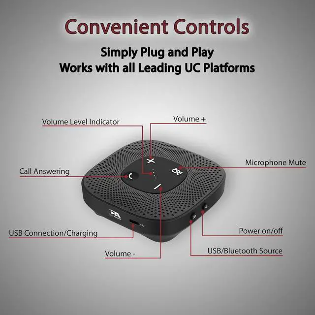 MULTI-PURPOSE USE Connect with USB to your PC or Mac and Bluetooth to your Smartphone. Simple switch between PC/Mac and Smartphone with the press of a button. Work handsfree or turn any room in to a conference room. Microphone mute and answer call buttons for use when connected to your Smartphone with Bluetooth. Works with all leading UC platforms.