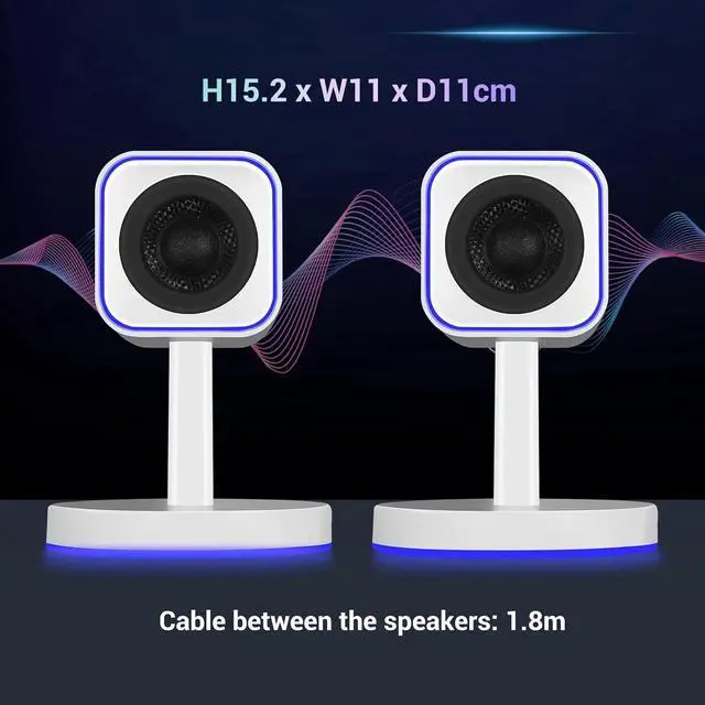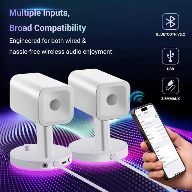 Eyesoul SW202 24W PC Gaming Speakers with 16bit DAC USB, Bluetooth 5.2 and Aux Inputs, 3 EQ Sound Modes, 2.0 RGB Lighting Multimedia Speakers for Computer Desktop Monitor Laptop, White