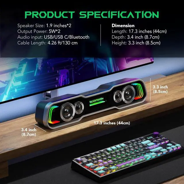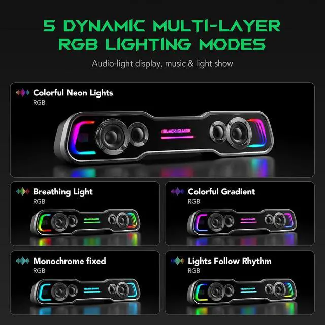 5 Dynamic Multi-Layer RGB Lighting ModesThe monitor speakers features five dynamic multi-Layer RGB lighting modes: Colorful Neon Lights, Breathing Light, Colorful Gradient, Monochrome fixed, Lights Follow Rhythm. Vibrant lighting creates an immersive ambiance for your gaming, movie, and music moments, delivering a captivating visual experience. Customize the effects to suit your personal preference - simply press the lighting button to switch between modes.